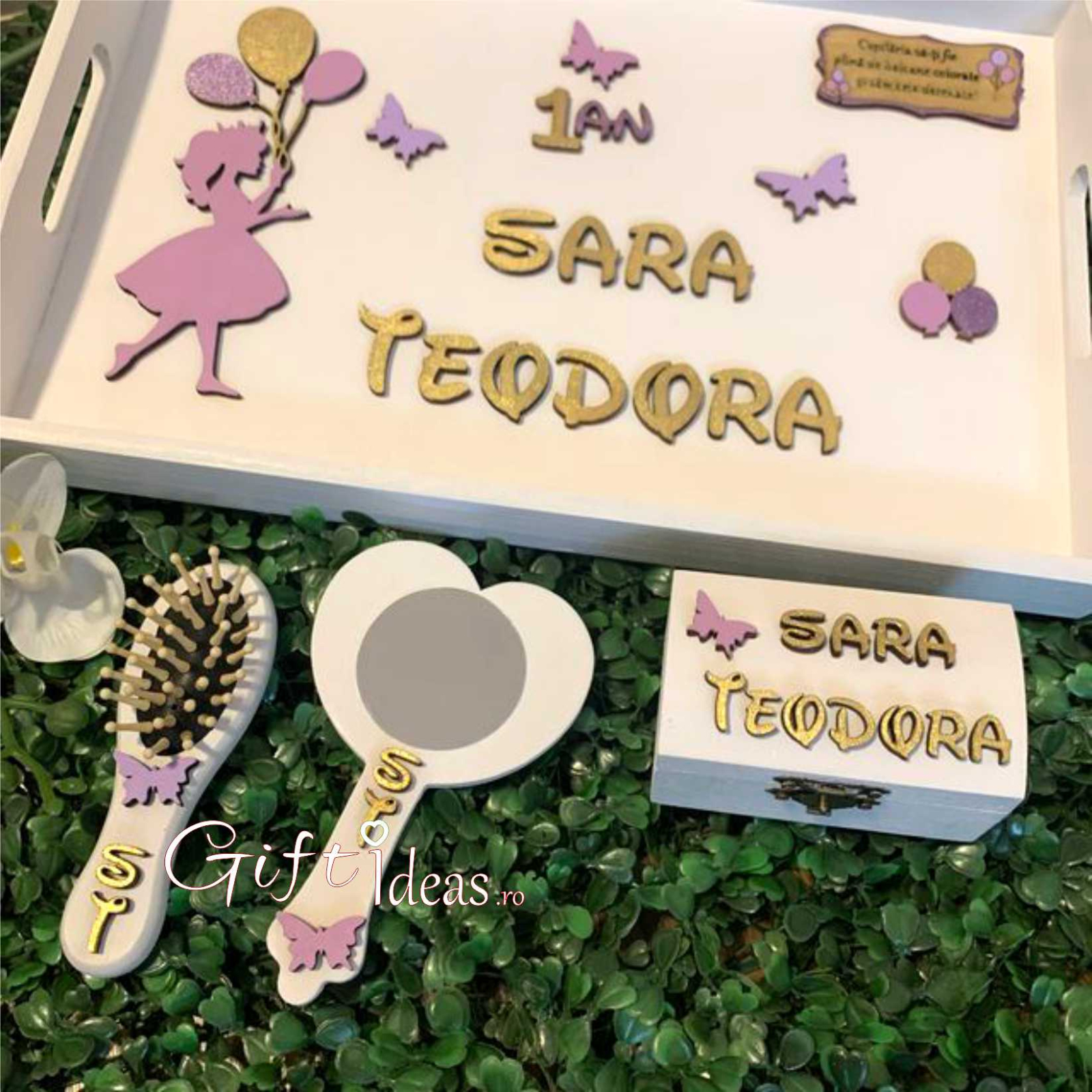 Set personalizat pentru mot, turta format din tavita, oglinda, perie si cutiuta amintiri cu tematica fetita, Printesa cu baloane. Produsele au aplicatii 3D si sunt vopsite manual.
