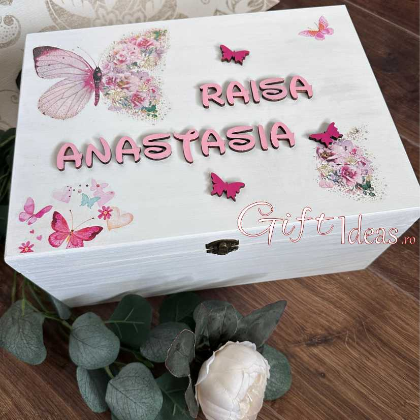 cufăr amintiri personalizat, cutie dar botez, mot, turta, cufăr trusou botez, decor tematic flori și fluturi, cutie moț turtă.