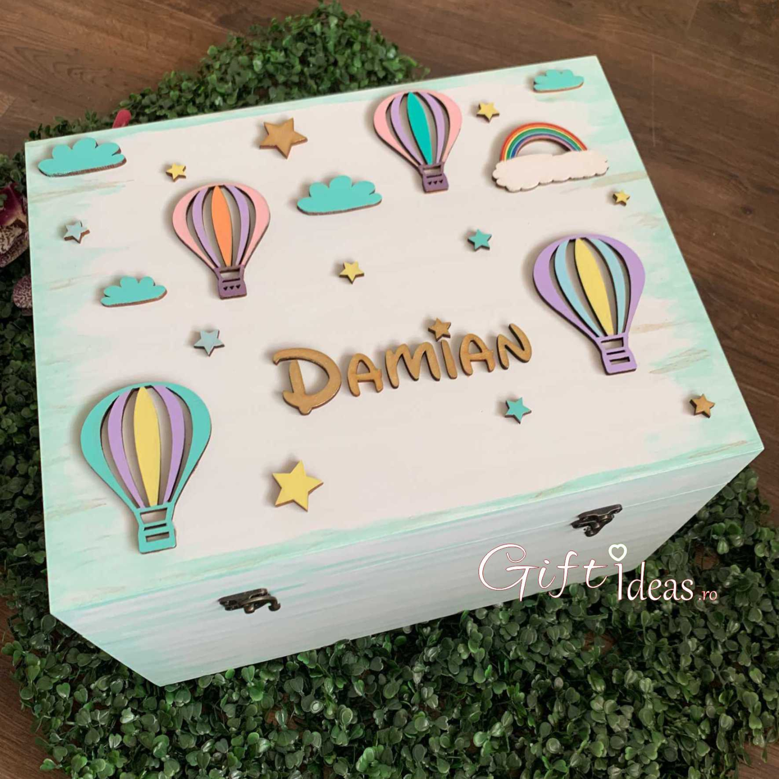 Cufar trusou, cutie de amintiri Baloane colorate, personalizat cu nume si aplicatii 3D.