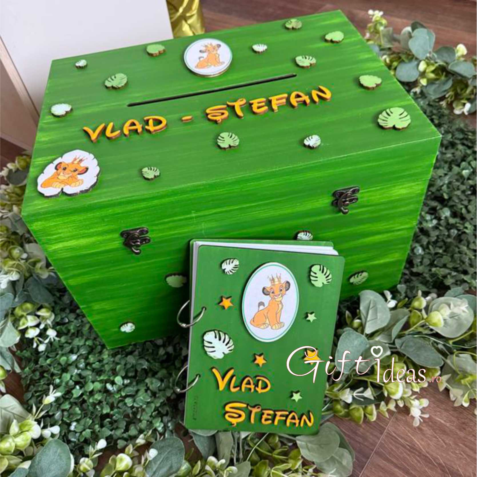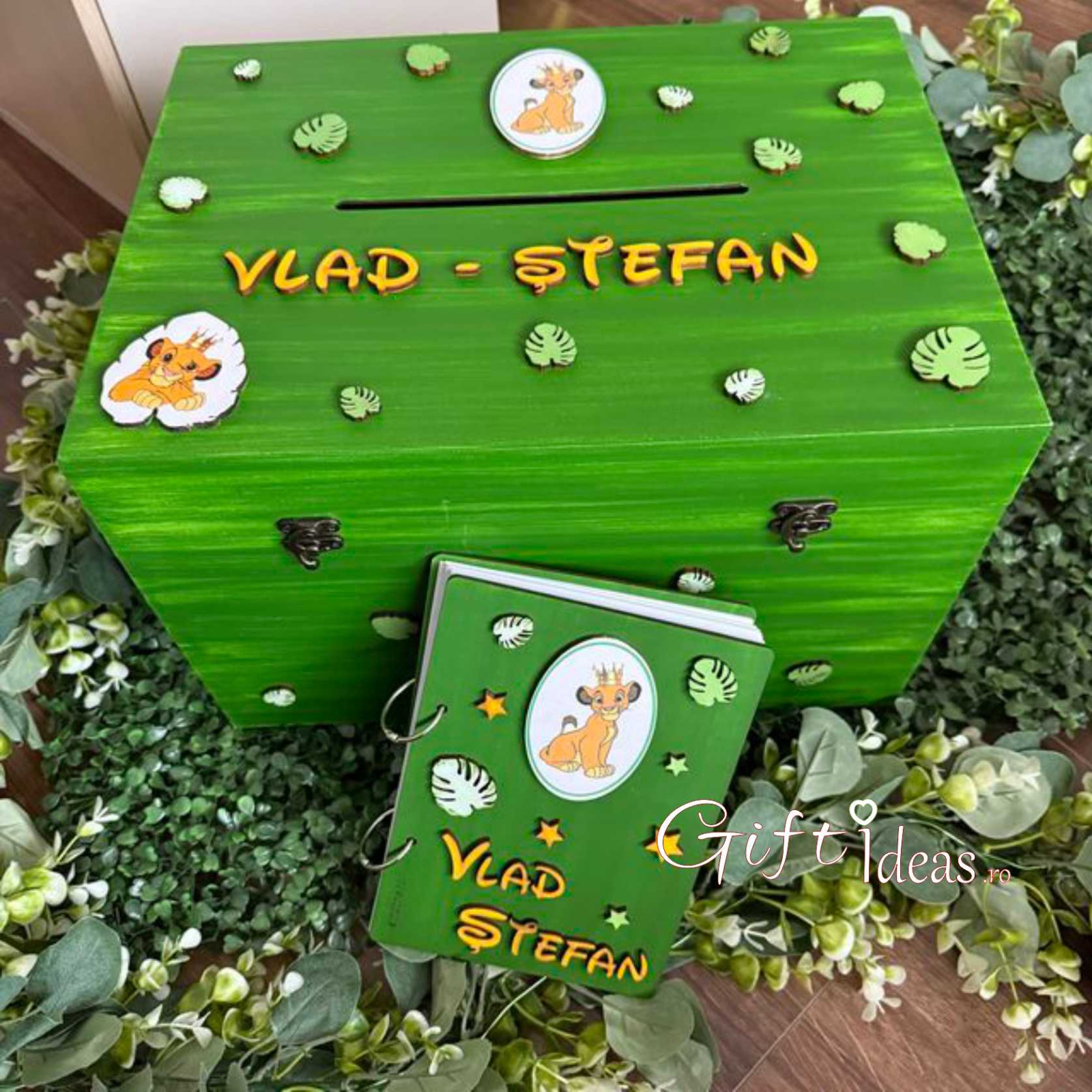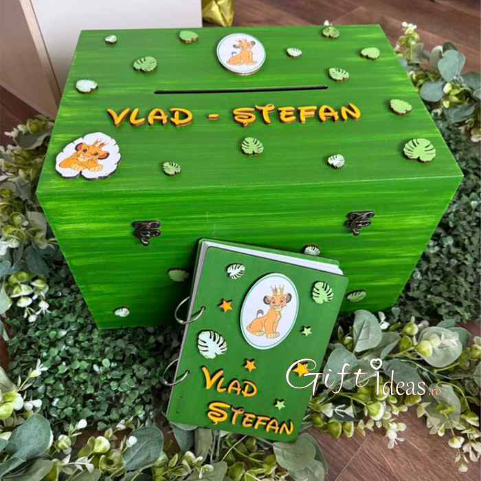 Set cadou amintiri personalizat - Simba Baby. Contine cufar amintiri si caiet/guestbook amintiri.