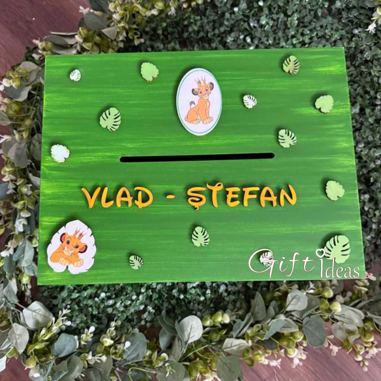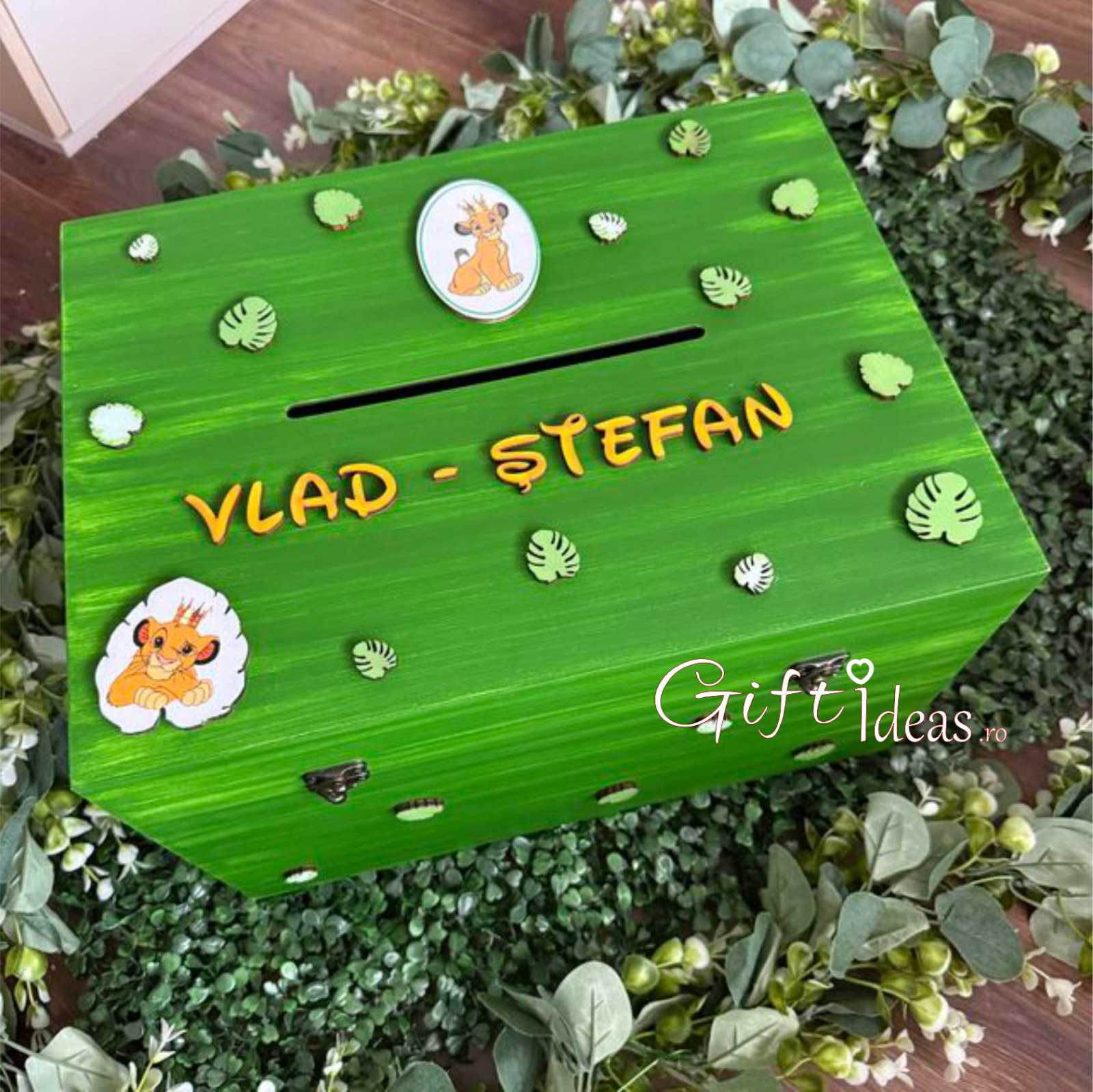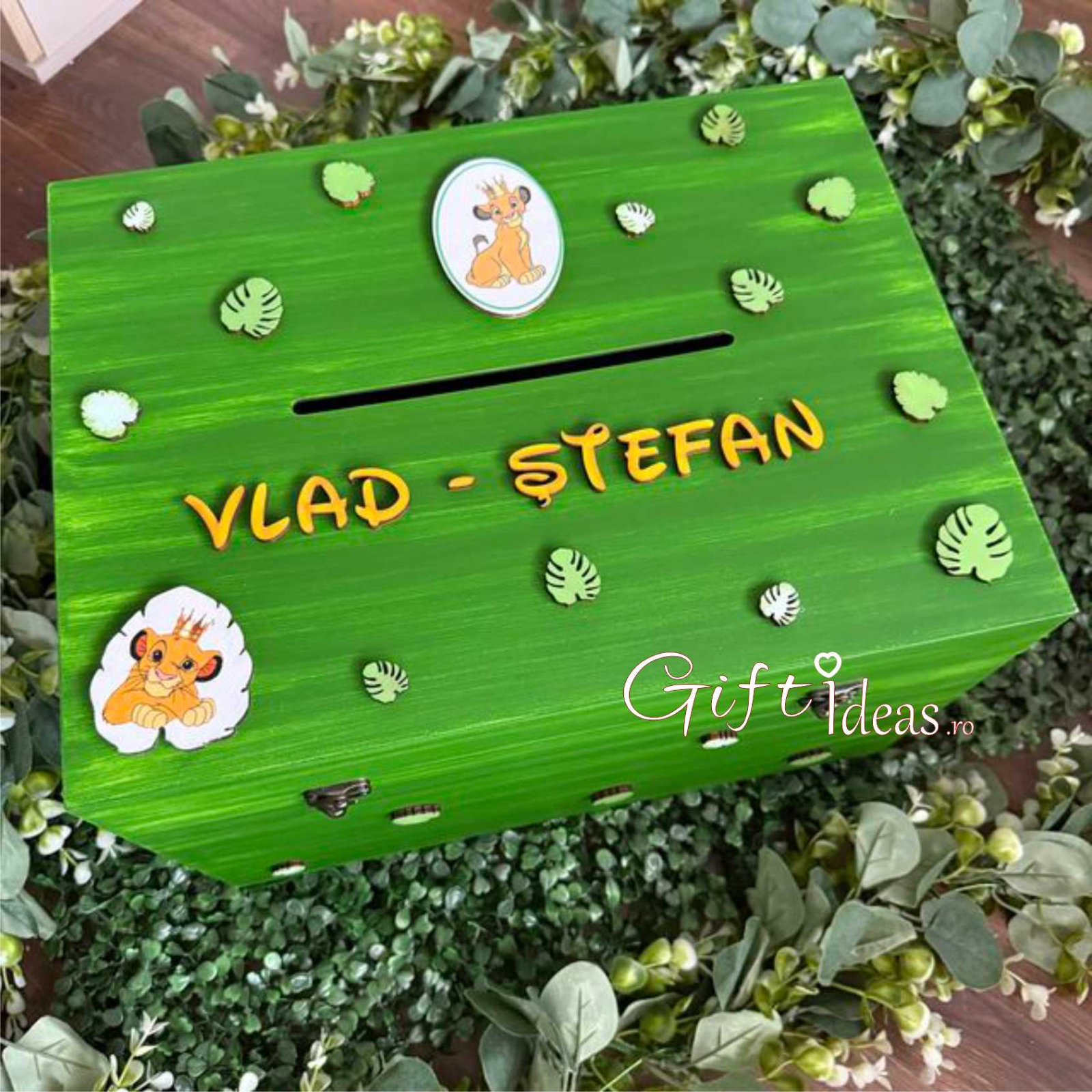 • Cufăr din lemn MDF 40x30x25 cm, pictat și personalizat cu numele copilului și detalii tematice Simba Baby