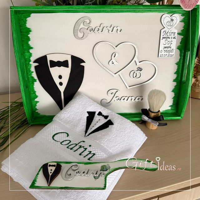- setul pentru barbierit mirele - un satar personalizat din placaj de lemn, pamatuf si prosop personalizat 50x90cm